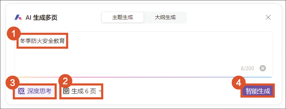 2 在【AI生成多页】面板中输入主题(如“冬季防火安全教育”),单击左下角的生成页数(1~10页)选项,选择合适的选项(如“生成6页”),开启【深度思考】功能,单击【智能生成】按钮。