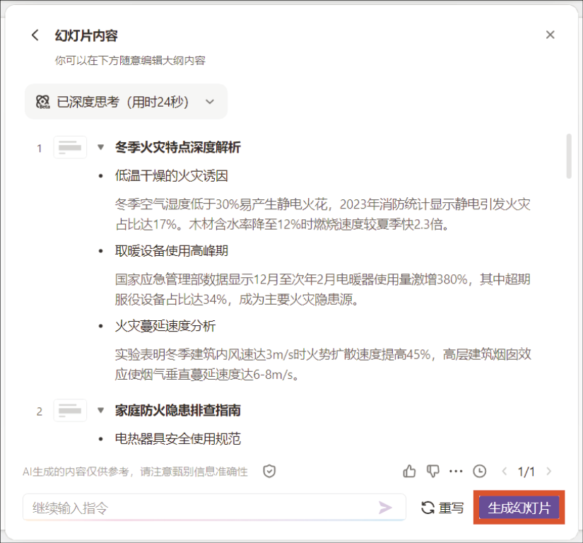 3 生成内容以后,可以在弹出的对话框中对文案进行修改。确认无误后单击【生成幻灯片】按钮。