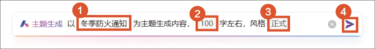 2 在弹出的窗口中,输入主题或关键词(如“冬季防火通知”)、需要的字数,并选择风格,单击右侧的