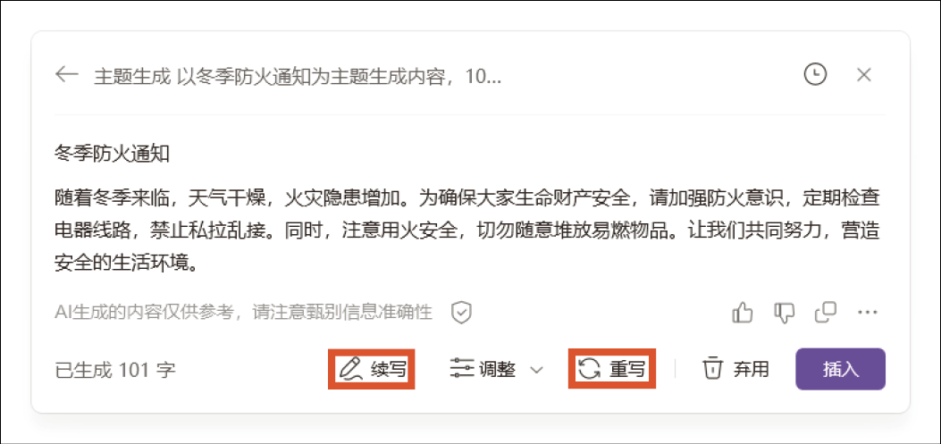 3 如果对生成的内容满意,想继续补充,可以单击【续写】按钮,继续补充内容。如果对生成的内容不满意,可以单击【重写】按钮,重新生成内容。