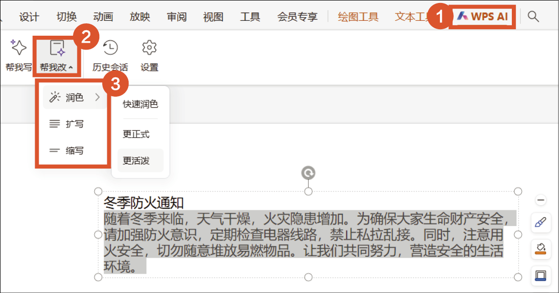 撰写文案内容较多的演示文稿时,即使反复修改文案,仍有可能存在语句拖沓、重点模糊等问题。如何快速优化表达并获取多种修改方案?利用WPS AI的【帮我改】功能可智能重构文本逻辑。
