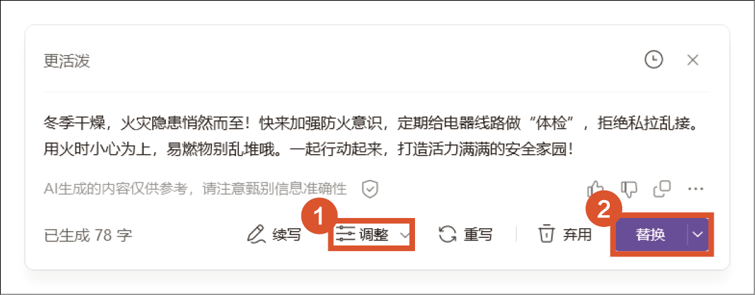● 文案润色:可以选择【快速润色】、【更正式】或【更活泼】方式对文案进行润色,生成内容以后,还可以单击下方的【调整】按钮,对文案进行多轮调整,单击【替换】按钮即可完成文案润色。