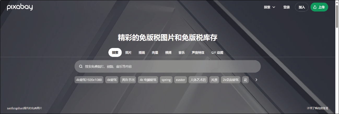 pixabay拥有上百万张优质图片和丰富的视频素材,支持中文检索。