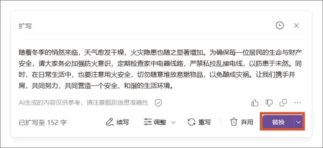 ● 文案扩写:可以补充文案内容,生成内容以后,单击【替换】按钮即可完成文案扩写。