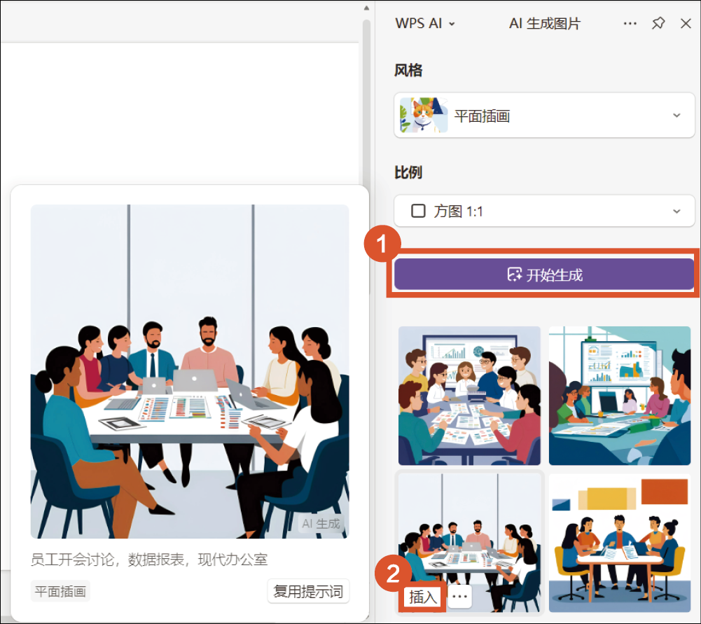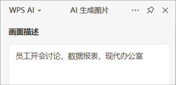 2 在侧边栏的输入框中,用文案描述想要的图片画面内容。可以通过“主体+背景”的结构进行描述,例如:想要一张会议的插画风格配图,可以写“员工开会讨论,数据报表,现代办公室”。