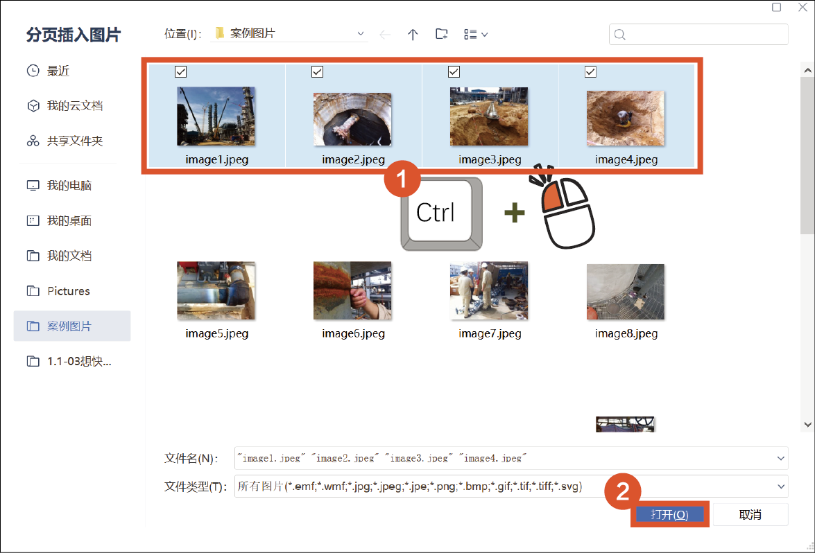 2 弹出【分页插入图片】窗口,按住【Ctrl】键的同时,鼠标左键单击选择要插入的图片,单击【打开】按钮,就可以把图片批量添加到每一页幻灯片中。