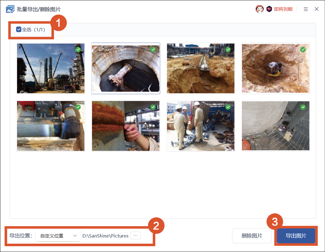 3 在【批量导出/删除图片】对话框中,勾选【全选】复选框,选择导出位置,最后单击【导出图片】按钮。