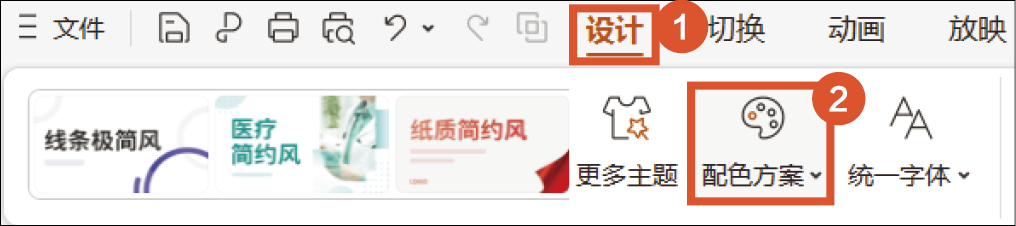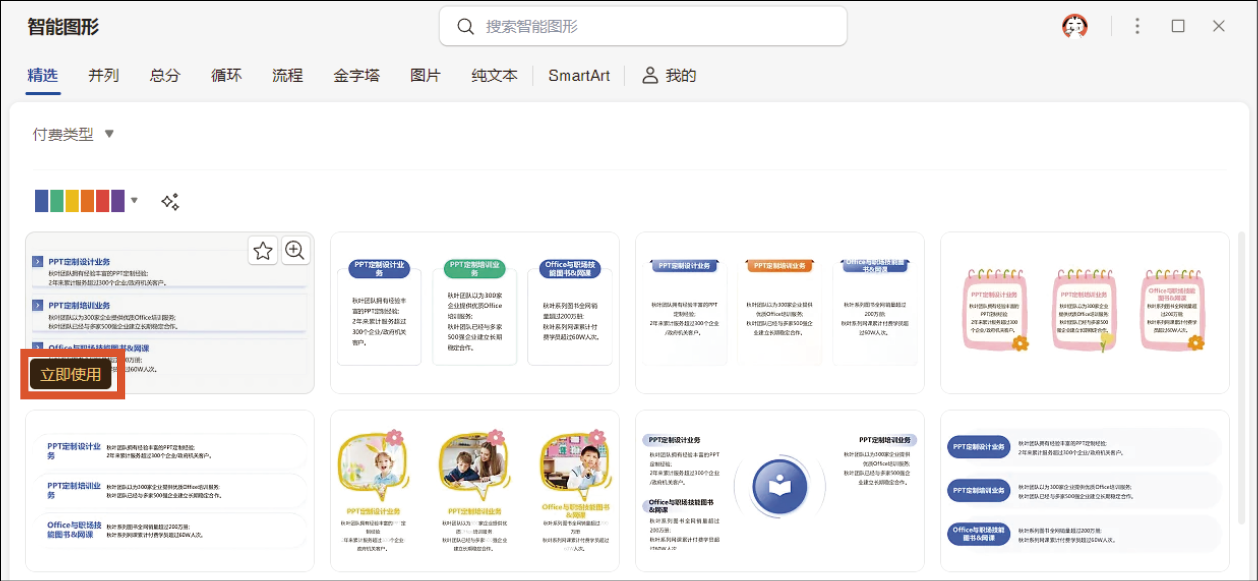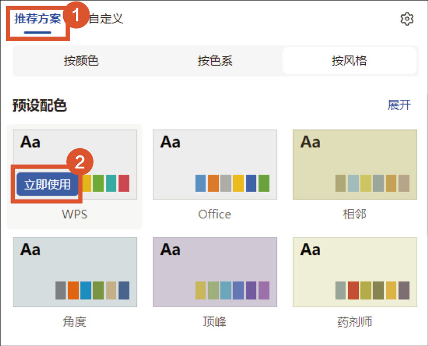 2 在弹出的菜单中有多种推荐方案(部分方案为会员功能),选择符合需要的配色方案,单击【立即使用】按钮,就可以将演示文稿的主题颜色快速换成我们需要的颜色。