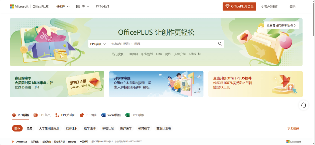 OfficePLUS是微软官方模板下载网站,拥有大量优质的免费和付费模板,不仅有演示模板,还有Word简历、文档及各种Excel图表等的模板,对学生或教育工作者特别实用。