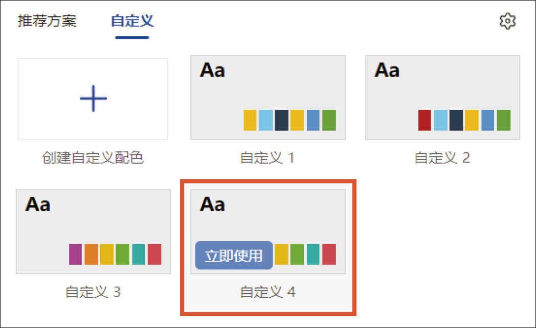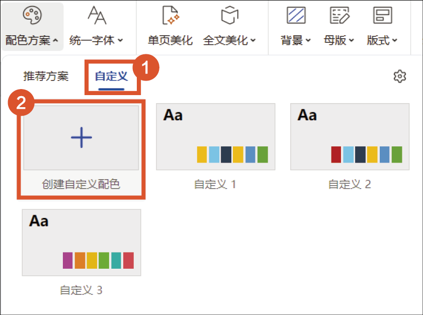 3 如果在推荐方案中没有合适的配色方案,还可以单击【自定义】选项卡,选择【创建自定义配色】选项。
