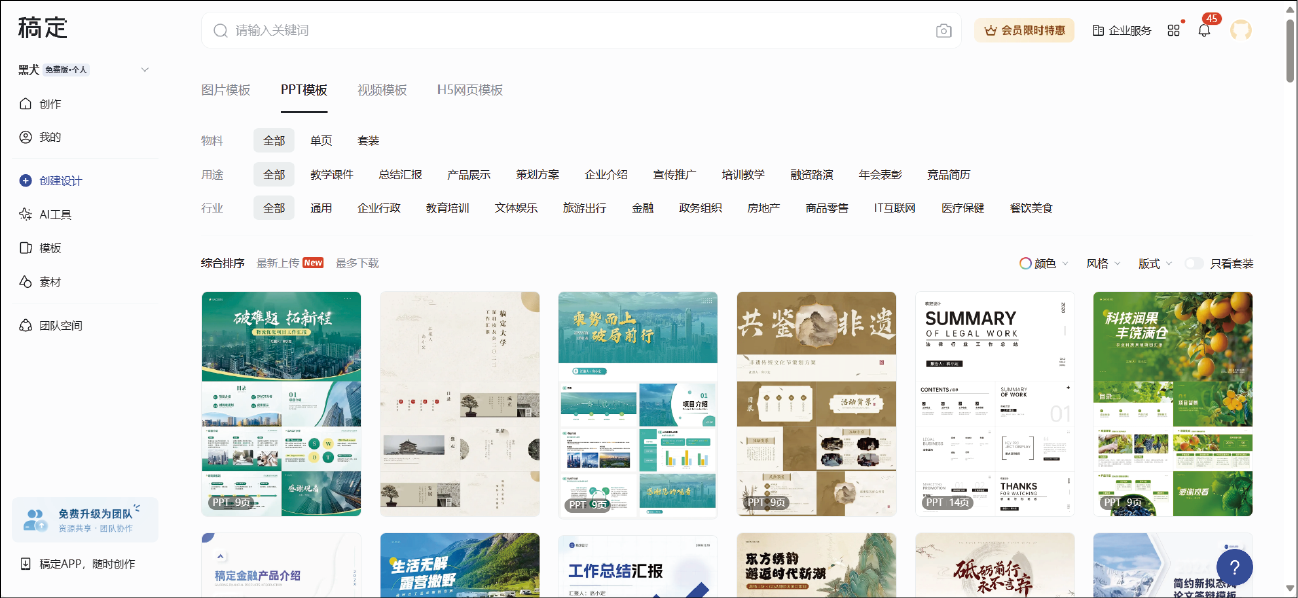 稿定设计网站提供的演示模板种类丰富,包含汇报、年会、简历等类型。