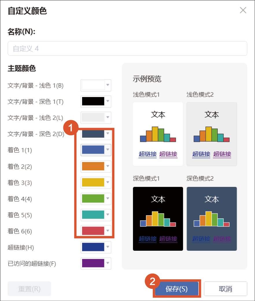 4 在弹出的【自定义颜色】对话框中,单击对应的配色选项,即可修改颜色,修改完成后,单击【保存】按钮,保存自定义配色方案。