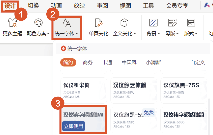 1 选择【设计】-【统一字体】命令,在弹出的菜单中选择合适的字体搭配方案(部分方案为会员功能),单击【立即使用】按钮,就可以将整个演示文稿的字体快速修改为我们需要的字体。
