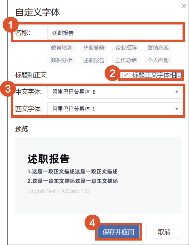 3 在弹出的【自定义字体】对话框中,为方案命名,勾选【标题正文字体相同】复选框(根据实际情况决定是否勾选,如果不勾选,则可以分别设置标题和正文的字体),并设置中文字体和西文字体,单击【保存并应用】按钮,就可以保存自定义字体方案,并应用到整个演示文稿中。
