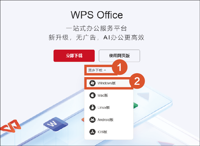 2 在网站首页找到“WPS Office”模块,单击【更多下载】按钮,在弹出的菜单中选择合适的版本进行下载。这里以“Windows版”为例进行演示。