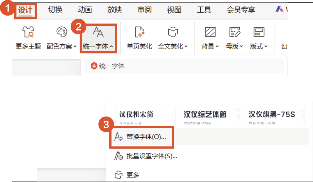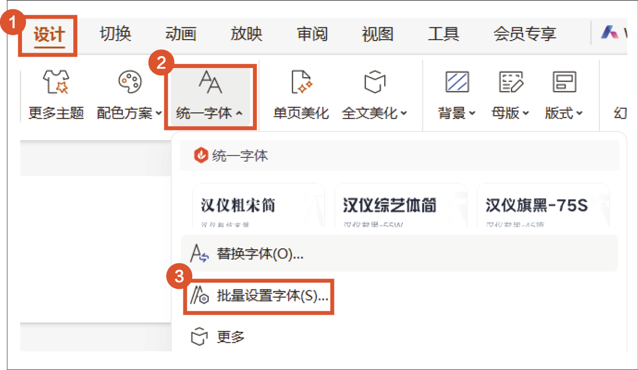 3 如果觉得每次只能替换一种字体太麻烦,还可以使用【批量设置字体】功能。选择【设计】-【统一字体】-【批量设置字体】命令。