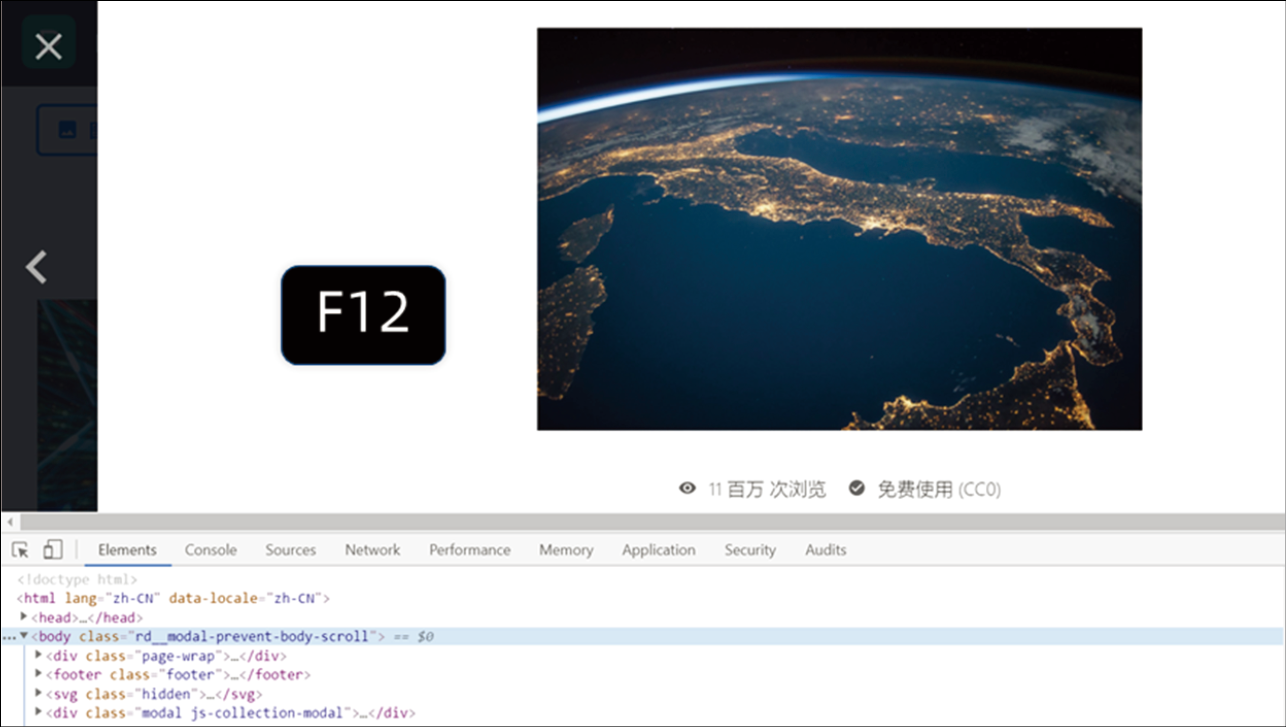 1 打开包含无法直接下载图片的网页,按【F12】键可以打开包含一些代码的开发调试工具面板。