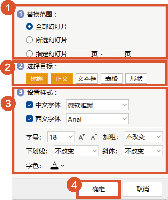 4 弹出【批量设置字体】对话框,在【替换范围】组中选择要替换字体的幻灯片范围,在【选择目标】组中选择要替换字体所在的位置,在【设置样式】组中统一设置中文字体、西文字体、字号和字色等,单击【确定】按钮,即可完成目标内容的字体替换。