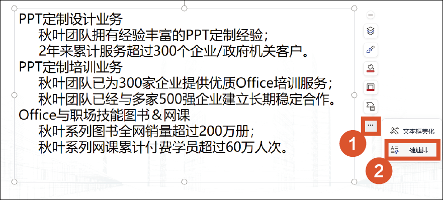 1 在对文本完成分级(见方法1的第1步)后,单击文本区域,在文本框右侧弹出的一列按钮中单击【…】按钮,选择【一键速排】命令。