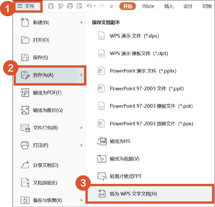 1 选择【文件】-【另存为】-【转为WPS文字文档】命令。
