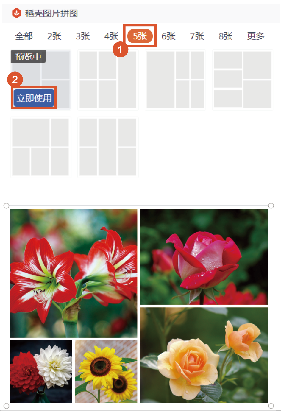 2 在弹出的对话框中根据图片数量筛选合适的模板(部分为会员专享模板),单击【立即使用】按钮进行排版。