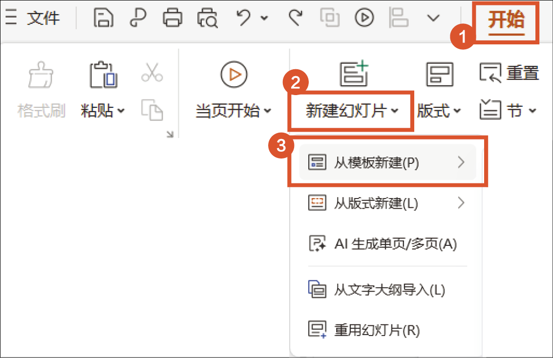 1 新建一份演示文稿,选择【开始】-【新建幻灯片】-【从模板新建】命令。