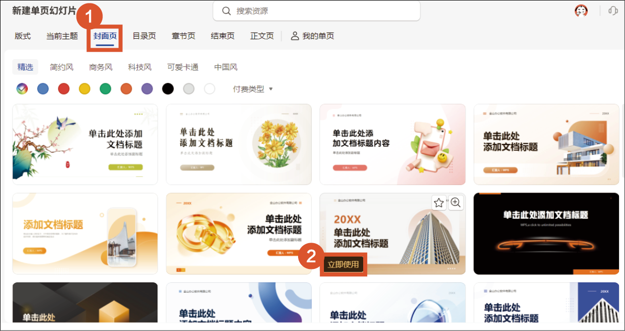 2 在弹出的对话框中,可以看到【封面页】、【目录页】、【章节页】、【结束页】、【正文页】等,这里以【封面页】为例。选择【封面页】选项,选择合适的模板(部分为会员专享模板),单击【立即使用】按钮,就可以直接使用该模板。