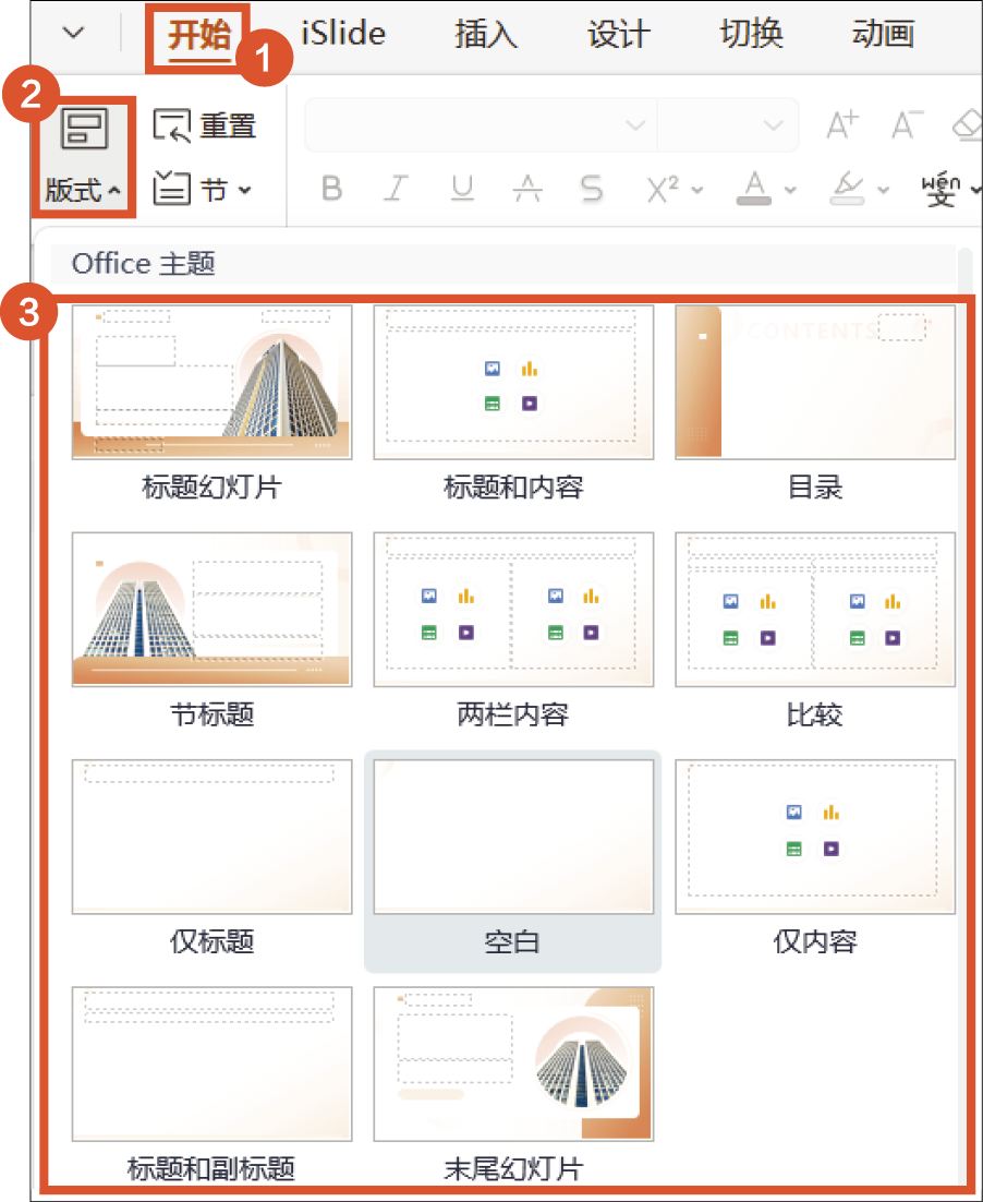 4 如果还需要使用和封面配套的其他模板页,可以选中新的页面,选择【开始】-【版式】命令,在弹出的菜单中选择【目录】、【节标题】、【仅标题】、【空白】或【末尾幻灯片】等命令使用模板页。
