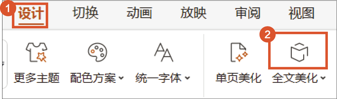 1 打开一份需要美化的演示文稿,选择【设计】-【全文美化】命令。