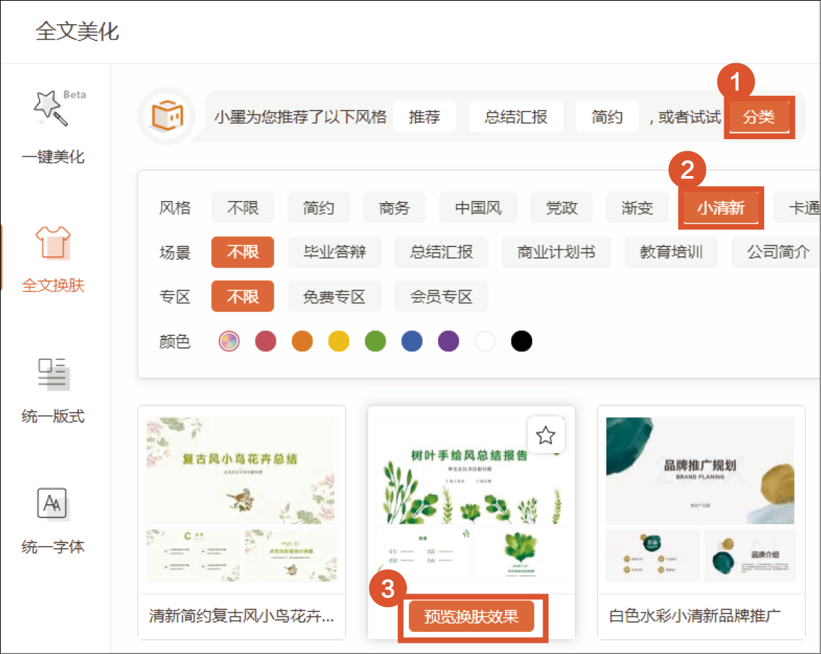 2 在弹出的【全文美化】对话框中,单击【分类】按钮展开筛选控件,在筛选控件中可以选择不同的风格,这里以【小清新】风格为例,单击【小清新】按钮,选择合适的模板后,单击【预览换肤效果】按钮进行预览。