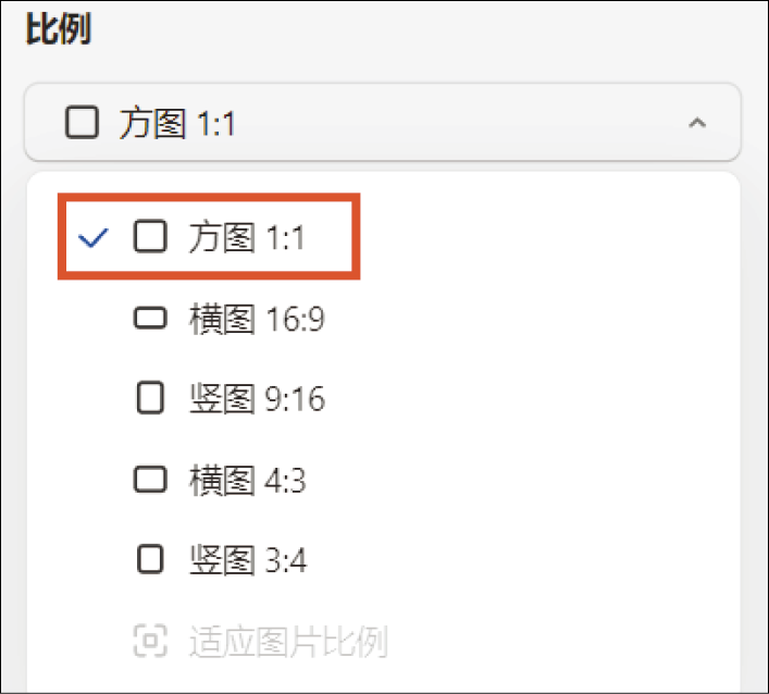 4 选择需要的图片比例,默认提供多种比例的选择,例如选择【方图1∶1】比例。