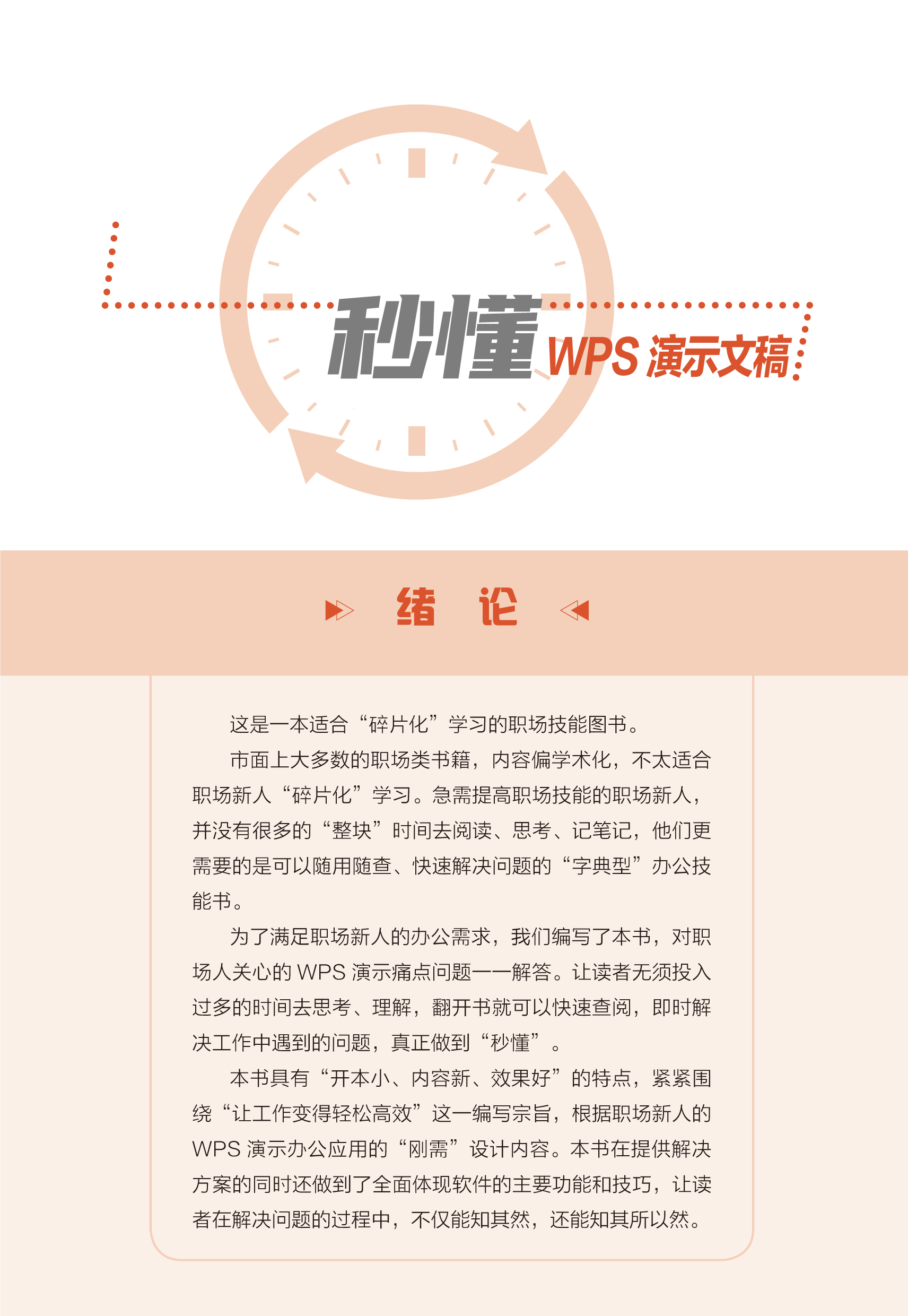 如何从WPS演示新手成长为高手,快速解决职场中遇到的各种各样的演示操作难题,就是本书所要讲述的内容。