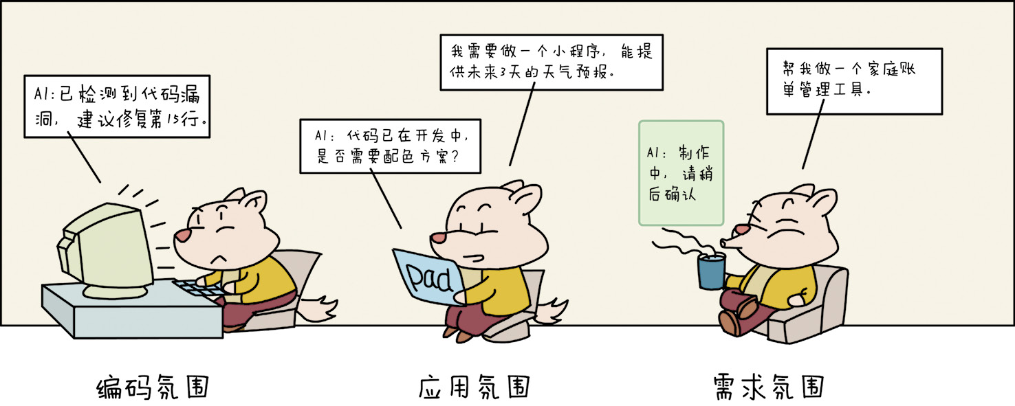 Vibe的本质是AI对编码领域的强大赋能,它解放了开发者和创意拥有者的生产力,让用编程创造价值这件事,多了一份沉浸其中的氛围感。但要注意的是,现阶段的氛围编程不是在轻松而无知的氛围中随意编程,而是在有想法和编程基础的前提下享受沉浸加速的氛围感。本书后续章节会结合近几年的AI编码的进化史,以及软件工程和编程语言的演进脉络,为大家进一步介绍Vibe Coding的来龙去脉。