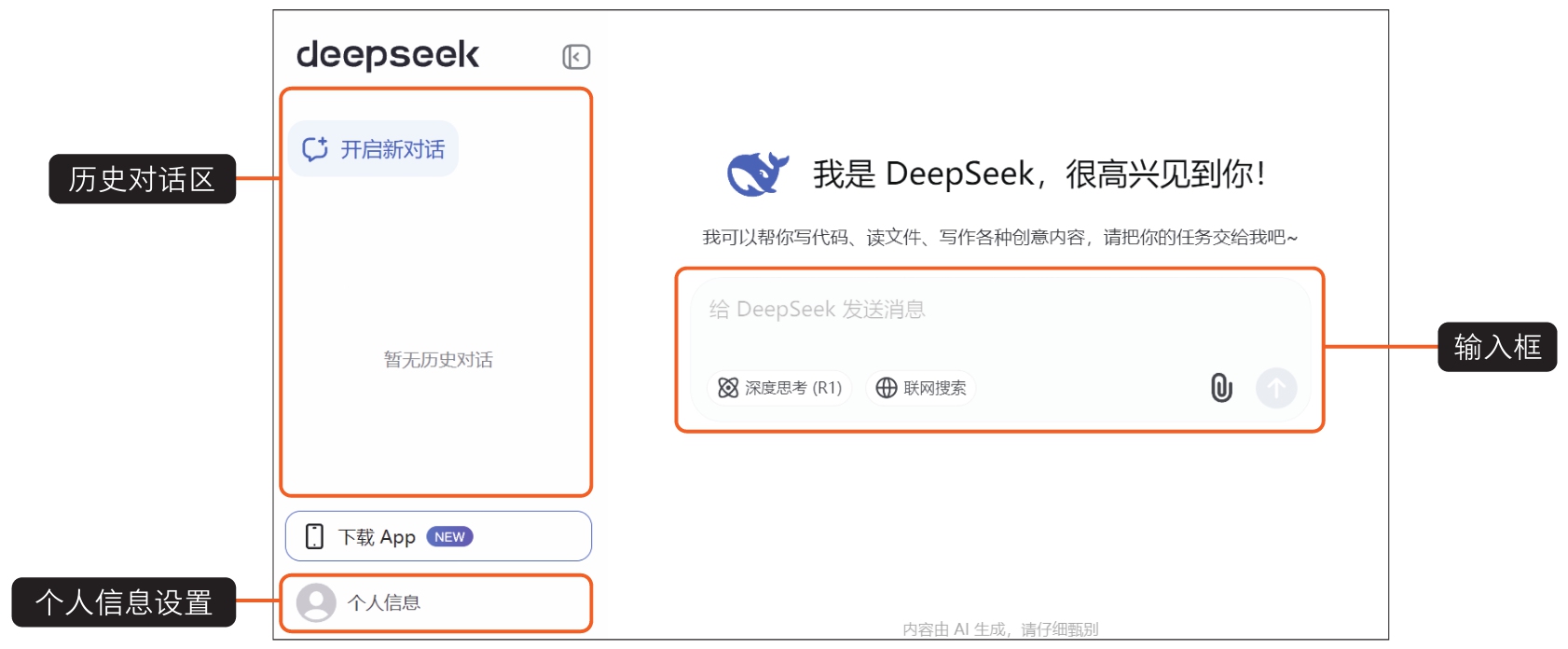 DeepSeek的界面设计以用户体验为核心,功能分区简洁、直观,用户可以轻松找到所需的操作选项,快速与模型进行交互。其界面主要分为输入框、历史对话区和个人信息设置,如图1-1所示。