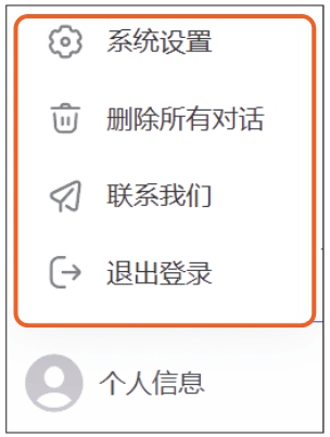 个人信息设置选项包含“系统设置”、“删除所有对话”、“联系我们”和“退出登录”,如图1-2所示。