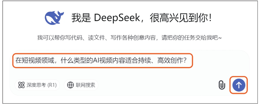 在输入框输入指令后,单击输入框右侧的“发送”按钮,即可将指令发送给DeepSeek,如图1-3所示。在输入指令时,尽量使用清晰、准确的语言表达自己的需求,避免模糊和歧义。