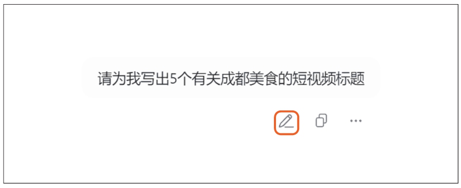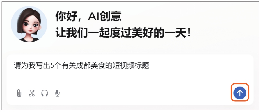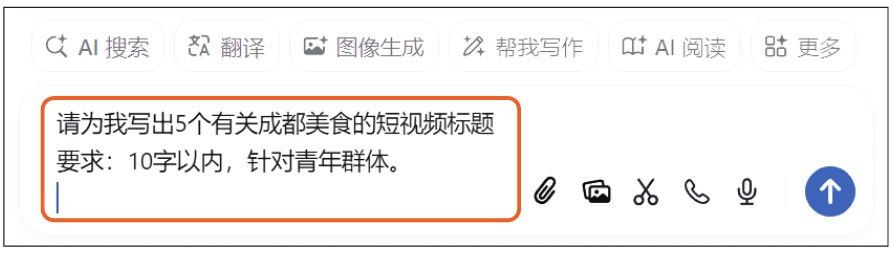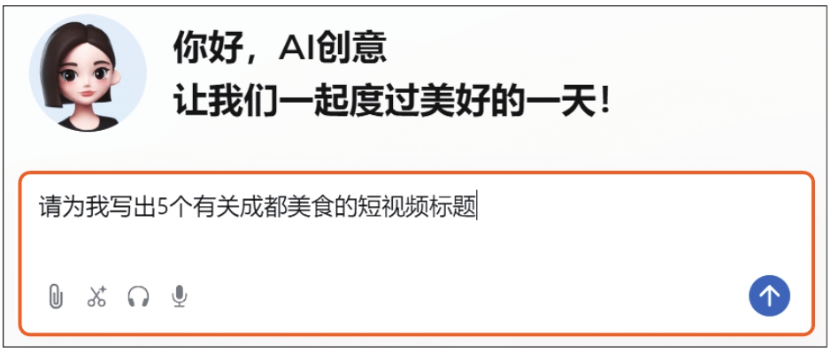 打开豆包以后,即可在首页的聊天窗口中输入对话内容。例如:单击输入框,在输入框中输入“请为我写出5个有关成都美食的短视频标题”,如图1-6所示。