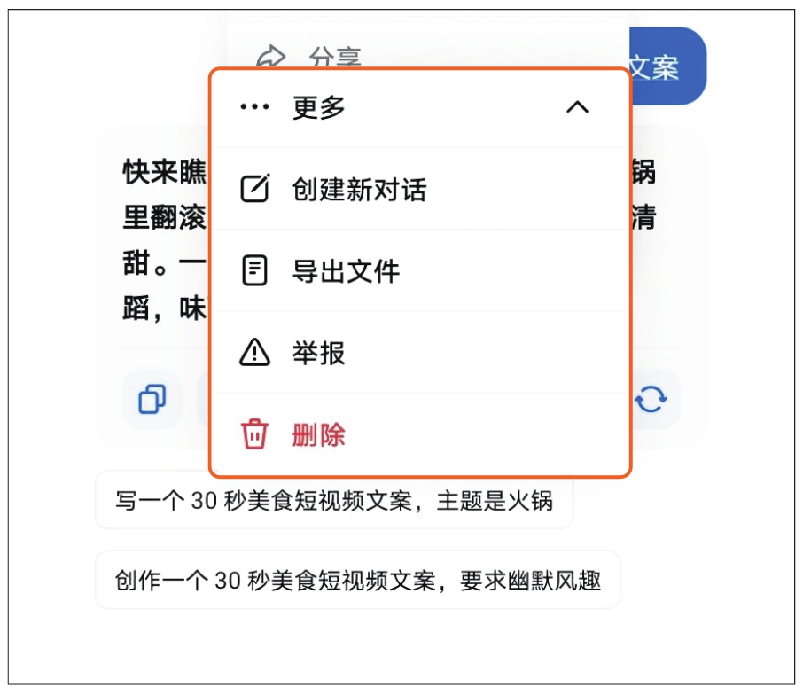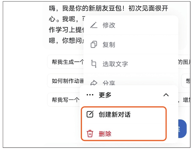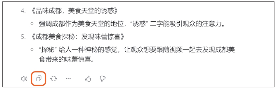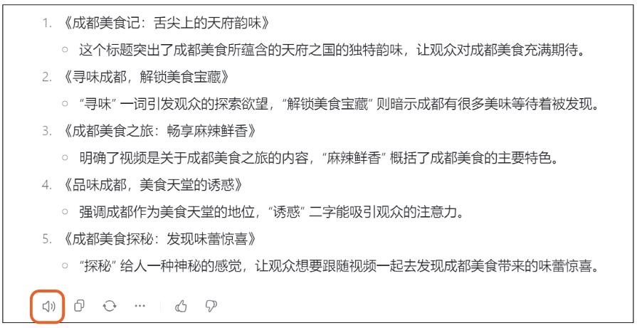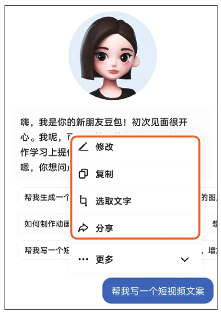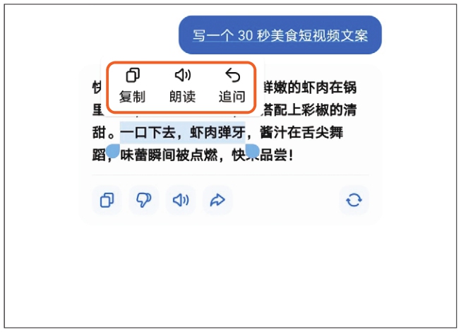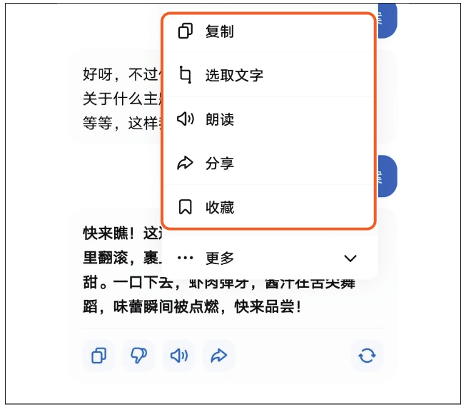 在豆包生成回复内容后,可以根据需要对其做进一步的操作来满足创作需求,其中包括语音朗读、复制、重新生成、收藏等选项。
