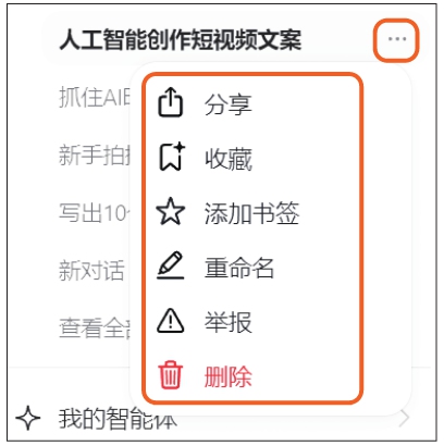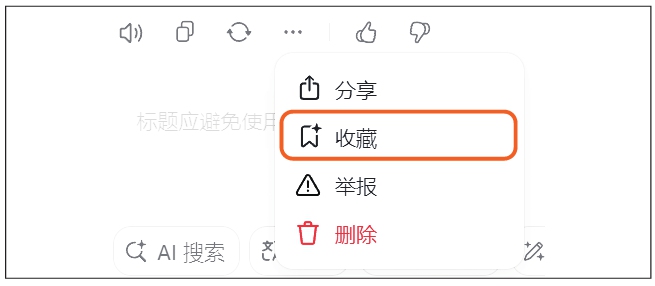 如果认为生成内容比较有价值,可以将其保存到“收藏夹”中,以便将来查阅和使用。单击“更多选项”按钮,在展开的菜单中选择“收藏”选项即可,如图1-12所示。