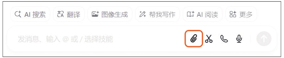 DeepSeek支持上传图片、文档等类型的文件作为输入内容。对于图片,模型会自动识别图中的文字信息;对于文档,模型可以对文档内容进行分析、总结、提取关键信息等操作。单击“上传附件”按钮即可选择本地文件进行上传,如图1-4所示。同时,可以在输入框输入对文件内容的执行要求。
