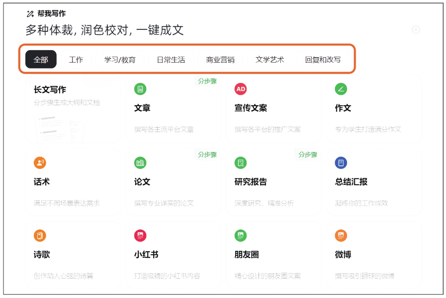 豆包具有特别广泛的适用性,能够在不同的领域和情境中为用户提供全面且有价值的帮助和回答,用户可以根据自己当前的需求选择相应的对话模式。在左侧栏中选择“帮我写作”选项即可选择不同类型的对话模式,如图1-45所示。