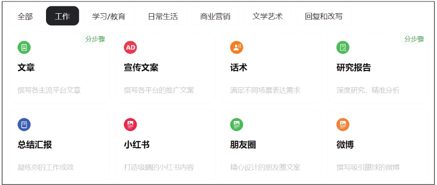 “工作”方面的提问模式包含“文章”、“宣传文案”、“话术”和“研究报告”等,如图1-46所示。具体操作方法如下。