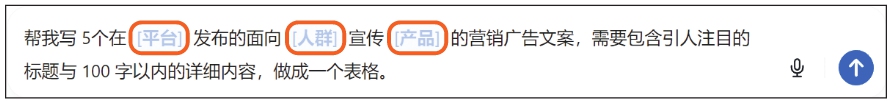 步骤1 选择“宣传文案”模式,在标蓝的位置可以根据提示词填入对应的描述语,如图1-47所示。