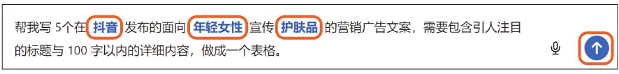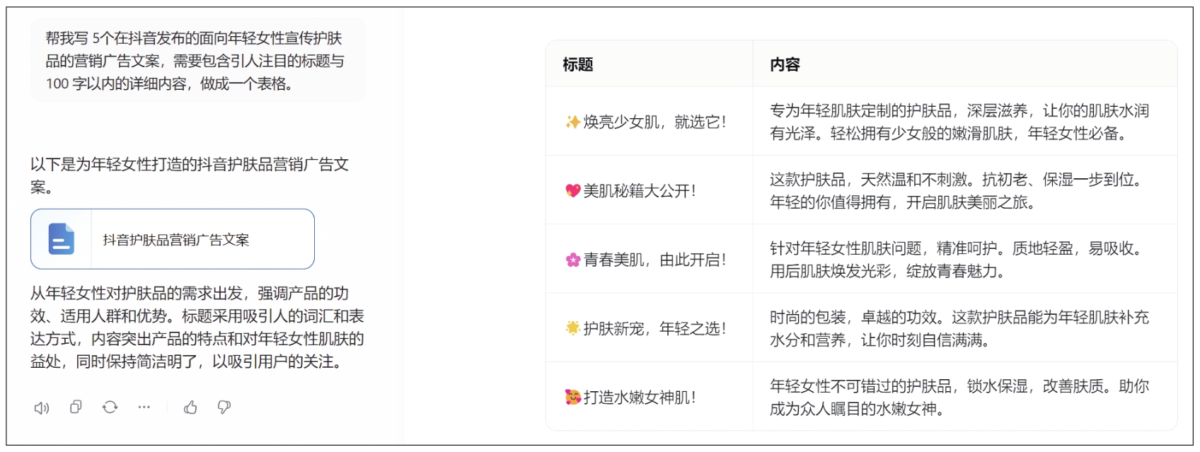 步骤2 以女性护肤品宣传文案为例,填入对应的描述语,单击“发送”按钮,如图1-48所示。