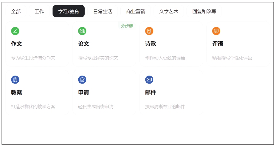 “学习/教育”方面的提问模式包含“作文”、“论文”、“诗歌”和“评语”等,如图1-50所示。