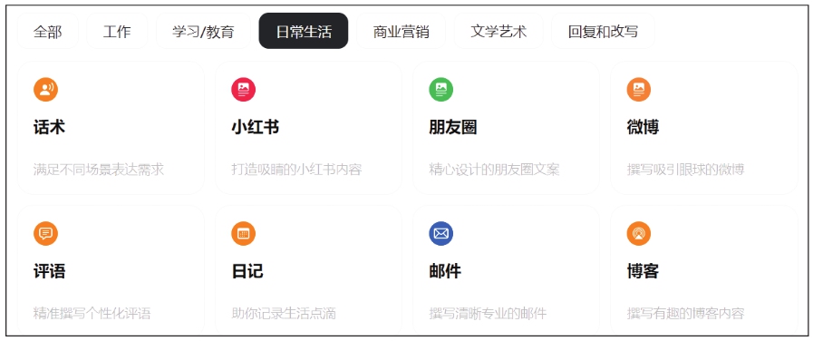 “日常生活”方面的提问模式包含“话术”、“小红书”、“朋友圈”和“微博”等,如图1-51所示。