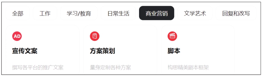 “商业营销”方面的提问模式包含“宣传文案”、“方案策划”和“脚本”,如图1-52所示。