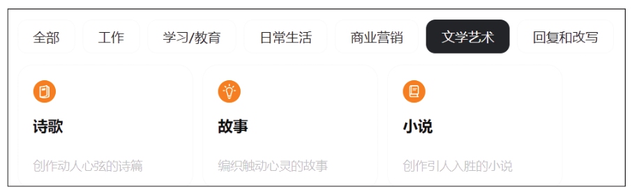 “文学艺术”方面的提问模式包含“诗歌”、“故事”和“小说”,如图1-53所示。