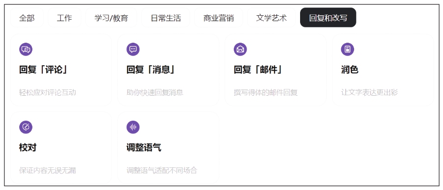 “回复和改写”方面的提问模式包含“回复‘评论’”、“回复‘消息’”和“回复‘邮件’”等,如图1-54所示。