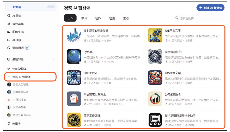 在左侧栏中选择“发现AI智能体”选项即可查看各类智能体的具体用途,如图1-55所示。